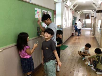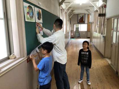 1、2年生が先生のお手伝い。 自分が描いた絵が掲示されて嬉しそうです。 「わたしの、これ。」と教えてくれました。