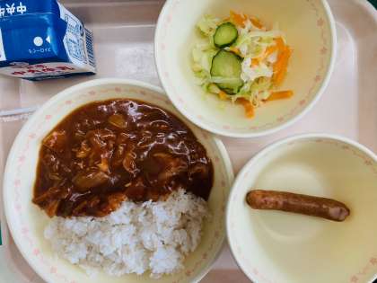 本日の給食は、『麦ごはん、牛乳、ハヤシライス、ウインナー、フレンチサラダ』です。とても美味しかったです。ごちそうさまでした!