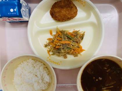 本日の給食は、『ごはん、牛乳、ミンチカツ、きんぴらごぼう、豚汁』です。とても美味しかったです。ごちそうさまでした!