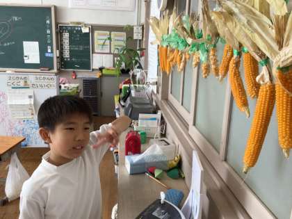 ともえの教室に収穫したとうもろこしが吊るしてあります。このとうもろこしは、ポップコーン用のもので、乾燥させたあと、調理するそうです。美味しくできるといいですね。