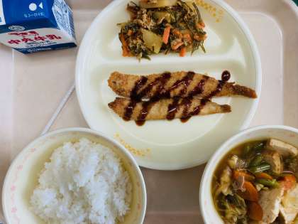 本日の給食は、『ごはん、牛乳、ししゃもフライ、糸こんぶの炒め煮、豚肉と生揚げの煮物』です。とても美味しかったです。ごちそうさまでした!