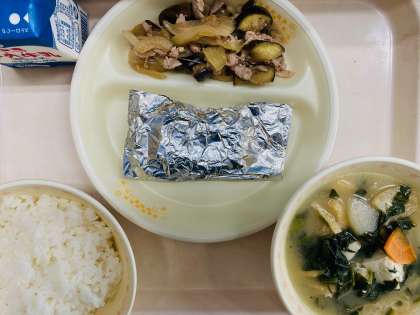 本日の給食は、『ごはん、牛乳、さけのおろし銀紙焼き、なすと豚肉の炒め物、ほうれん草の白みそ汁』です。とても美味しかったです。ごちそうさまでした!