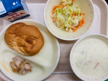 今週は日本型食生活週間です。本日の給食は、『りんごパン、牛乳、グリルチキン、サワーキャベツ、コーンポタージュ』です。とても美味しかったです。ごちそうさまでした!