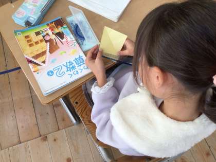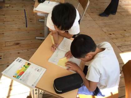 長方形から正方形を作り、どんな形か調べています。