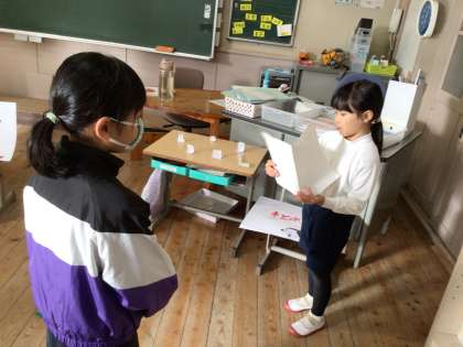 2年生は、国語でおもちゃの遊び方を説明する文章を書く学習をしました。今日は、他の学年の子を招いて手作りおもちゃ遊びの会を開いていました。自分で考えたおもちゃの遊び方を一生懸命に伝えていました。遊びに来た子も楽しそうでした。