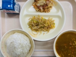 本日の給食は『白玉うどん、牛乳、手作りかきあげ、おかかあえ、カレーなんばん』です。とても美味しかったです。ごちそうさまでした!