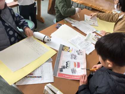 図書室で司書さんと和の文化について調べたことを画用紙にまとめていました。