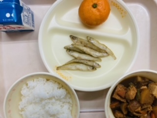 本日の給食は『ごはん、牛乳、わかさぎの唐揚げ、根菜のみそ煮、みかん』です。とても美味しかったです。ごちそうさまでした!