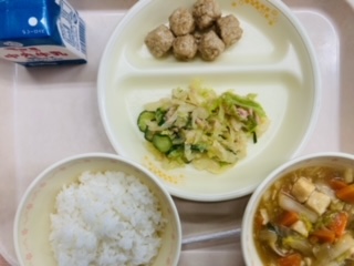 1月12日給食 公開日 2024/01/12 更新日 2024/01/12 お知らせ 本日の給食は『ごはん、牛乳、肉だんごのあんがらめ、華風あえ、豆腐の中華煮』です。とても美味しかったです。ごちそうさまでした!