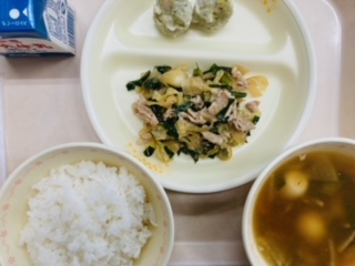 本日の給食は『ごはん、牛乳、野菜入りしゅうまい、豚肉のオイスターソース炒め、うずら卵の中華スープ』です。とても美味しかったです。ごちそうさまでした!