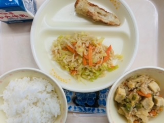 本日の給食は『ごはん、牛乳、ちくわの紅しょうが揚げ、切干し大根のごま酢あえ、高野豆腐のうま煮、海の五目佃煮』です。とても美味しかったです。ごちそうさまでした!
