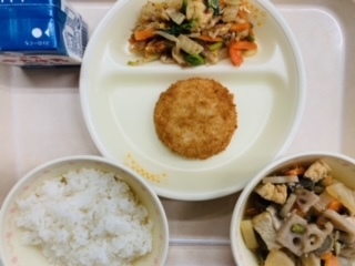 今日の給食は豊田ブランドの日献立です。『ごはん(ミネアサヒ)、牛乳、まるっととよたひまわりポークコロッケ、おかかあえ、根菜のうま煮』です。とても美味しかったです。ごちそうさまでした!