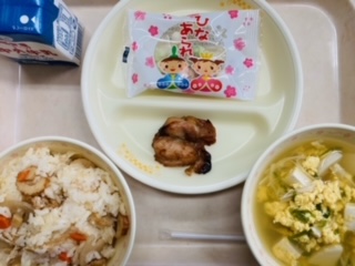 3月1日給食 公開日 2024/03/01 更新日 2024/03/01 お知らせ 今日の給食はひなまつり献立です。『ちらしずし、牛乳、とり肉の照り焼き、かきたま汁、ひなあられ』です。とても美味しかったです。ごちそうさまでした!