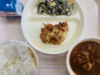 今日の給食は『白玉うどん、牛乳、みそ煮込み風うどん、わんぱくじゃこ天、健康サラダ』です。とても美味しかったです。ごちそうさまでした!