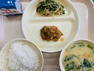 今日の給食は『ごはん、牛乳、油淋鶏、もやしのナムル、ワンタン入り卵スープ』です。とても美味しかったです。ごちそうさまでした!