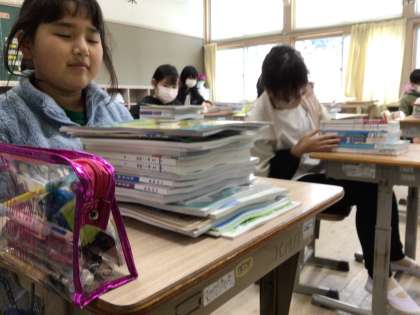 中、高学年に配られる教科書は複式で2学年分なのでとてもたくさんです。