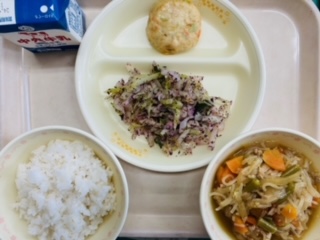 今日の給食は『麦ごはん、牛乳、豆腐しんじょ、ゆかりあえ、豚丼』です。とても美味しかったです。ごちそうさまでした!