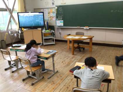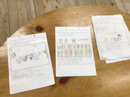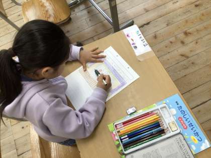 1年生に学校にはどんな部屋があるか、それはどんな場所か紹介するために調べています。3人なので一人で何枚もカードを書きます。