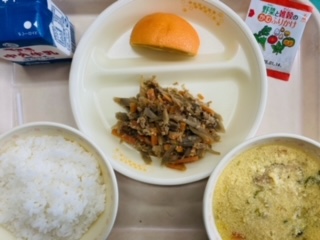今日の給食は『ごはん、牛乳、きんぴらごぼう、かきたま汁、オレンジ(生)、ふりかけ(野菜と雑穀)』です。とても美味しかったです。ごちそうさまでした!