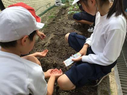 校舎前の花壇に、ヒマワリ、オクラ、ダイズの種をまきました。