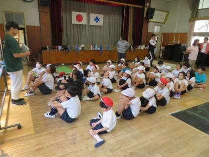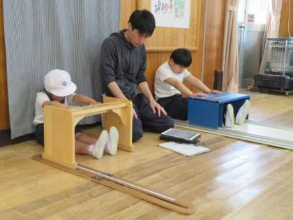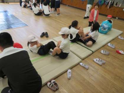 室内では、立位体前屈、反復横跳び、上体起こし、握力、立ち幅跳びの測定です。