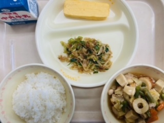 ?[image0.jpeg]今日の給食は『ごはん、牛乳、厚焼き卵、おかかあえ、高野豆腐のうま煮』です。とても美味しかったです。ごちそうさまでした!