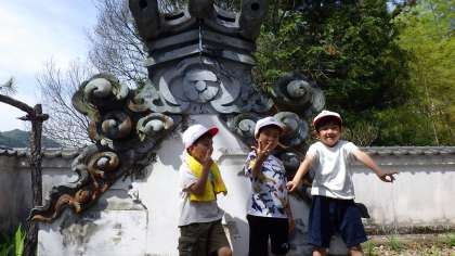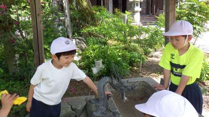 子どもたちが探検に出かけたのは、田振地区にある楽圓寺。手水舎や鐘、大きな鬼瓦など、たくさんの発見がありました。本堂の中にも入れていただきました。自分たちが住む町の素敵なところを実際に見たり触ったり、お話を聞いたりすることで、さらに追分の町が好きになっていくと思います。