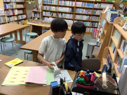 朝の図書室は、一番賑わう時間です。 図書委員の二人が忘れずに仕事に来て、貸し出しの手続きをしていました。