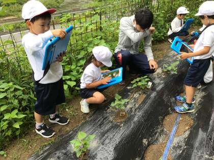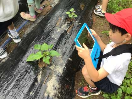 1、2年生 生活科 公開日 2024/05/31 更新日 2024/05/31 各学年から 1、2年生は生活科でさつまいもを育てています。今日は学習用タブレットを持って、観察に出かけました。葉っぱの数を数えたり手触りを確認したりしてじっくりと観察をしてから写真を撮りました。これからの生長が楽しみです。