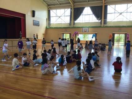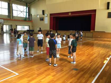 元城小学校に着くと、元城小学校のお友達が体育館でお花のアーチを作って迎えてくれました。恥ずかしそうにしながらも笑顔でアーチをくぐる追分っ子たちでした。体育館では、今日の予定や自己紹介、元城小クイズなどを楽しみました。クイズの最後に「裁判所」の地図記号が出されました。元城小学区には裁判所があるのだそうです。