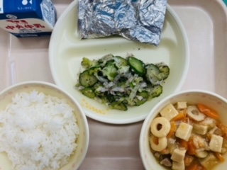 今日の給食は『ごはん、牛乳、さけのおろし銀紙焼き、ゆかりあえ、えびと高野豆腐のうま煮』です。とても美味しかったです。ごちそうさまでした!
