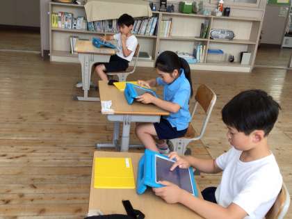 四季の4シーンをプログラミングしました。一番好きな季節は大胆な動きにして、好きであるとアピールします。できあがったら、友達前で発表し、どの季節が一番好きかを当て合いました。自分がどう動かしたいかをはっきり決めてそれが実現できるように考えてプログラミングしました。どの子も一番好きな季節が友達に伝わるように作成することができました。