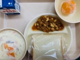 今日の給食は『スライスパン、牛乳、チリコンカン、ポタージュスープ、冷凍みかん(生)』です。とても美味しかったです。ごちそうさまでした!