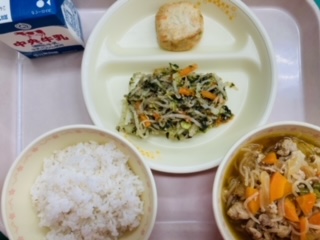 今日の給食は『麦ごはん、牛乳、豆腐しんじょ、のり酢あえ、豚丼』です。とても美味しかったです。ごちそうさまでした!