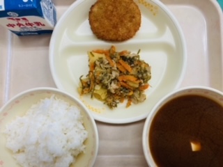 今日の給食は『ごはん、牛乳、えだまめコロッケ、糸こんぶの炒め煮、とうがんのみそ汁』です。とても美味しかったです。ごちそうさまでした!