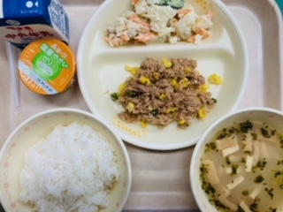 今日の給食は防災の日献立です。『ごはん、牛乳、ツナそぼろ丼、じゃがいもと大豆のサラダ、みそ汁(備蓄用)、野菜ゼリー』です。とても美味しかったです。ごちそうさまでした!