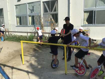 一輪車練習 公開日 2024/09/24 更新日 2024/09/24 学校行事 運動会での発表に向けて一輪車の練習に励んでいます。 大きい子たちは、手を繋いで大きな車輪を作って回転の練習です。 12年生は今年は発表はありませんがお兄さん、お姉さんの様子を見て一緒に練習しています。