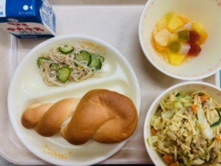 今日の給食は『ツイストパン、牛乳、華風あえ、海鮮焼きそば、フルーツゼリーミックス』です。とても美味しかったです。ごちそうさまでした!