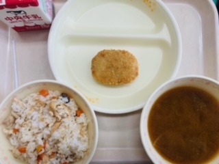10月18日給食 公開日 2024/10/19 更新日 2024/10/19 お知らせ 今日の給食は『きのこごはん、牛乳、かつおのミンチカツ、さつまいものみそ汁』です。とても美味しかったです。ごちそうさまでした!