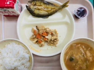 今日の給食は豊田ブランドの日です。『ごはん、牛乳、あゆの一夜干し揚げ、とよたチャンプルー、きのこのみそ汁、ブルーベリーゼリー』です。とても美味しかったです。ごちそうさまでした!