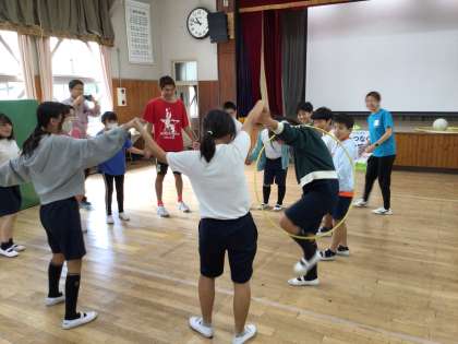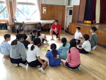 今日は、5、6年生の教室に夢先生の石川直生先生が来てくださいました。キックボクシングのチャンピオンになられた方です。はじめは、集会室でナオキックと一緒にゲームをしました。手をつないだままフラフープをくぐったり、ボールが手から離れている間だけ動けるルールで、みんなで手をつないだままゴールを目指したりしました。テーマは協力。どうしたらタイムを縮められるか、ゴールまでたどりつけるか、ナオキックと一緒に作戦を立てました。やってみて、みんなでどうしたらいいか考えて、もう一度チャレンジです。チャレンジするたびにまとまりが生まれてきました。協力することの大切さを体感しました。