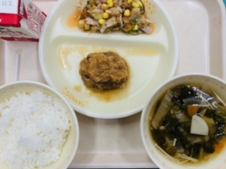 今日の給食は『ごはん、牛乳、ハンバーグのみぞれあんかけ、りっちゃんの元気サラダ、具だくさん汁』です。とても美味しかったです。ごちそうさまでした!