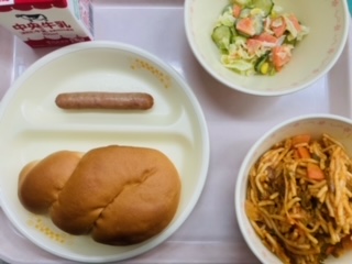 今日の給食は『ツイストパン、牛乳、イタリアンスパゲティ、ウインナー、コーンサラダ』です。とても美味しかったです。ごちそうさまでした!