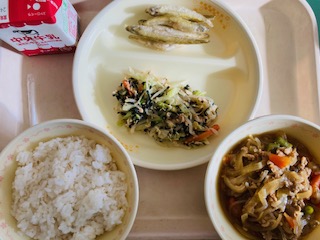 今日の給食は『麦ごはん、牛乳、わかさぎの唐揚げ、のり酢あえ、豚丼』です。とても美味しかったです。ごちそうさまでした!