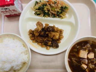 今日の給食は豊田ブランドの日献立です。『ごはん(ミネアサヒ)、牛乳、レバーと大豆のごまがらめ、おかかあえ、とよたのみそ汁』です。とても美味しかったです。ごちそうさまでした!