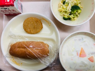 今日の給食は『米粉パン、牛乳、ミンチカツ、ブロッコリーサラダ、かぶとはくさいのクリームスープ』です。とても美味しかったです。ごちそうさまでした!