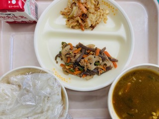 12月19日給食 公開日 2024/12/19 更新日 2024/12/19 お知らせ 今日の給食は『白玉うどん、牛乳、五目かきあげ、きんぴられんこん、カレーなんばん』です。とても美味しかったです。ごちそうさまでした!
