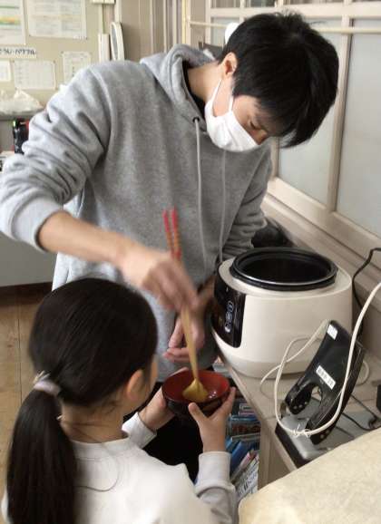 1、2年生、ともえのみなさんで収穫したさつまいもをおいしくいただきました。4時間目に、みんなで協力して食べやすい大きさに切り、炊飯器に入れてスイッチオン。5時間目にはおいしく食べることができました。「ほくほくしていておいしい」「おいものいいにおいがする」「焼いていないのに、やきいもみたいな味がする」と、大好評でした。食べきれなかったさつまいもは持ち帰ります。お家でもぜひ味わってみてください。