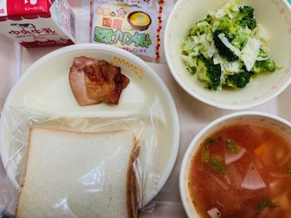 今日の給食はクリスマス献立です。『スライスパン、牛乳、照り焼きチキン、グリーンサラダ、ミネストローネ、セレクトデザート』です。とても美味しかったです。ごちそうさまでした!