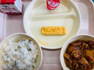 今日の給食は七草献立です。『七草ごはん、牛乳、厚焼きたまご、根菜のみそ煮、プチゼリー(アセロラ)』です。とても美味しかったです。ごちそうさまでした!
